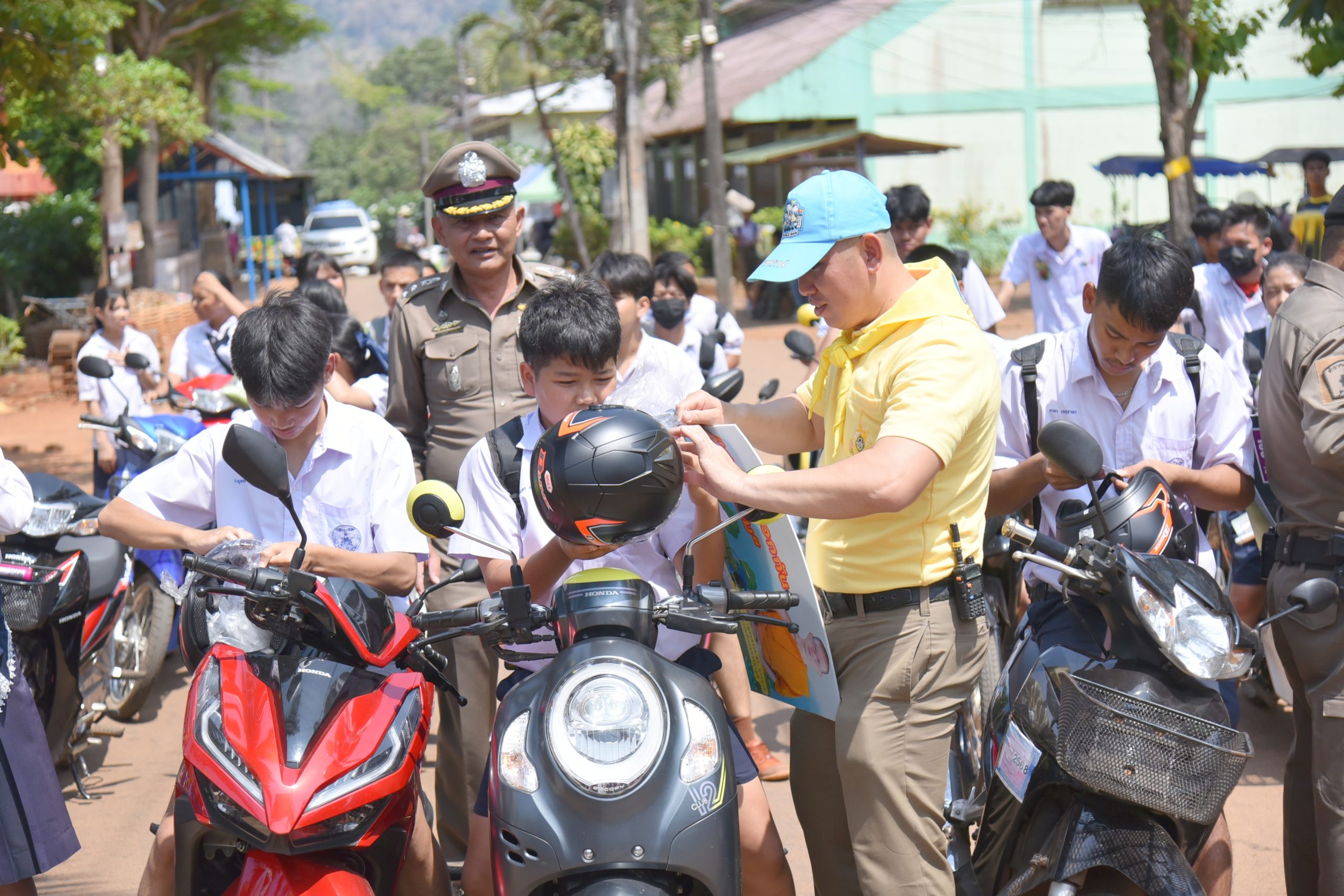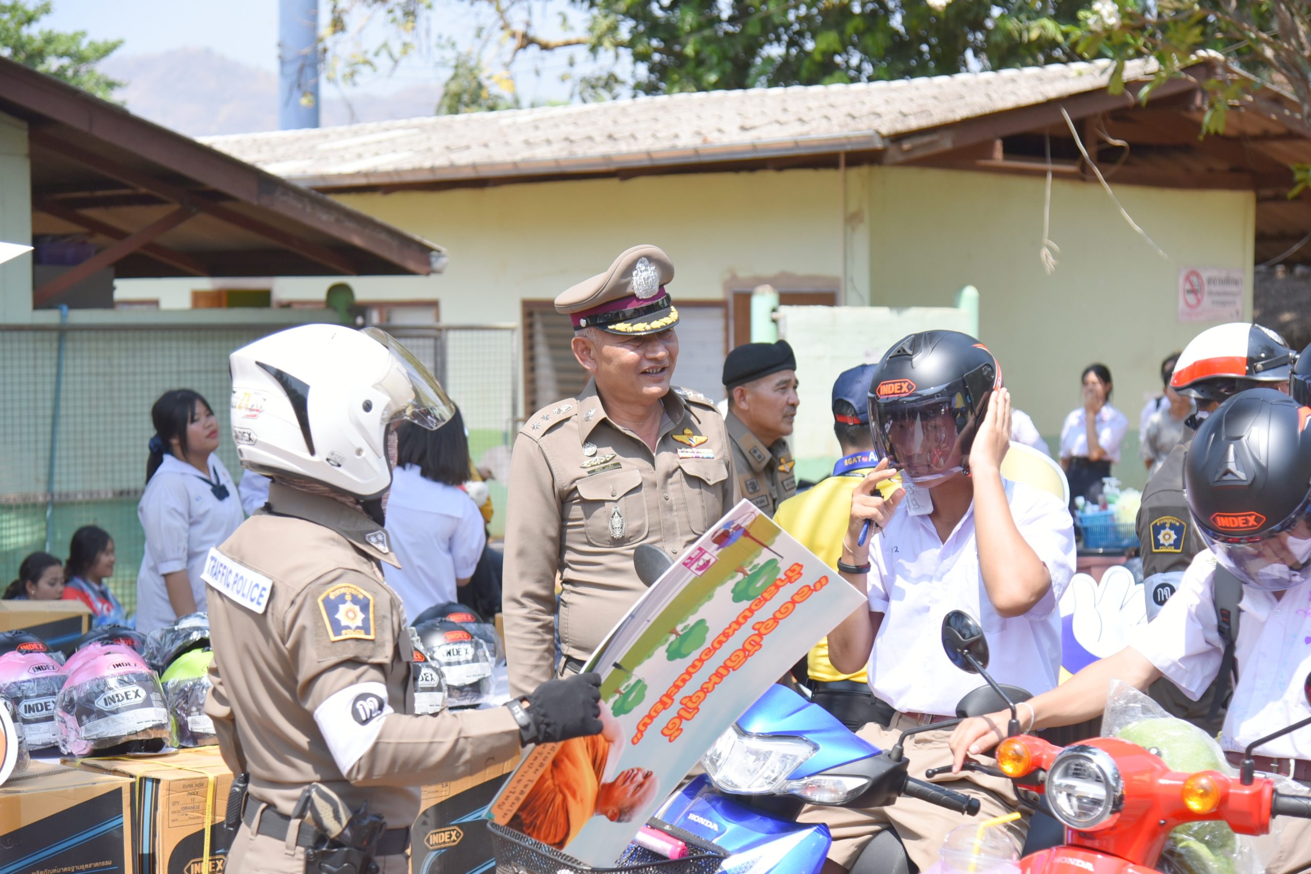 โดยมีการแนะนำและให้ความรู้ประชาชนและนักเรียนเกี่ยวกับการขับขี่รถจักรยานยนต์ต้องสวมหมวกนิรภัยทุกครั้งเพื่อลดการบาดเจ็บและการเสียชีวิตจากการเกิดอุบัติเหตุ ด้วยรักและความห่วงใย จากสถานีตำรวจภูธรทองผาภูมิ และได้มอบหมวกนิรภัยให้กับนักเรียนที่ไม่มีและไม่ได้สวมหมวกนิรภัยเพื่อความปลอดภัยในการใช้รถใช้ถนนร่วมกัน